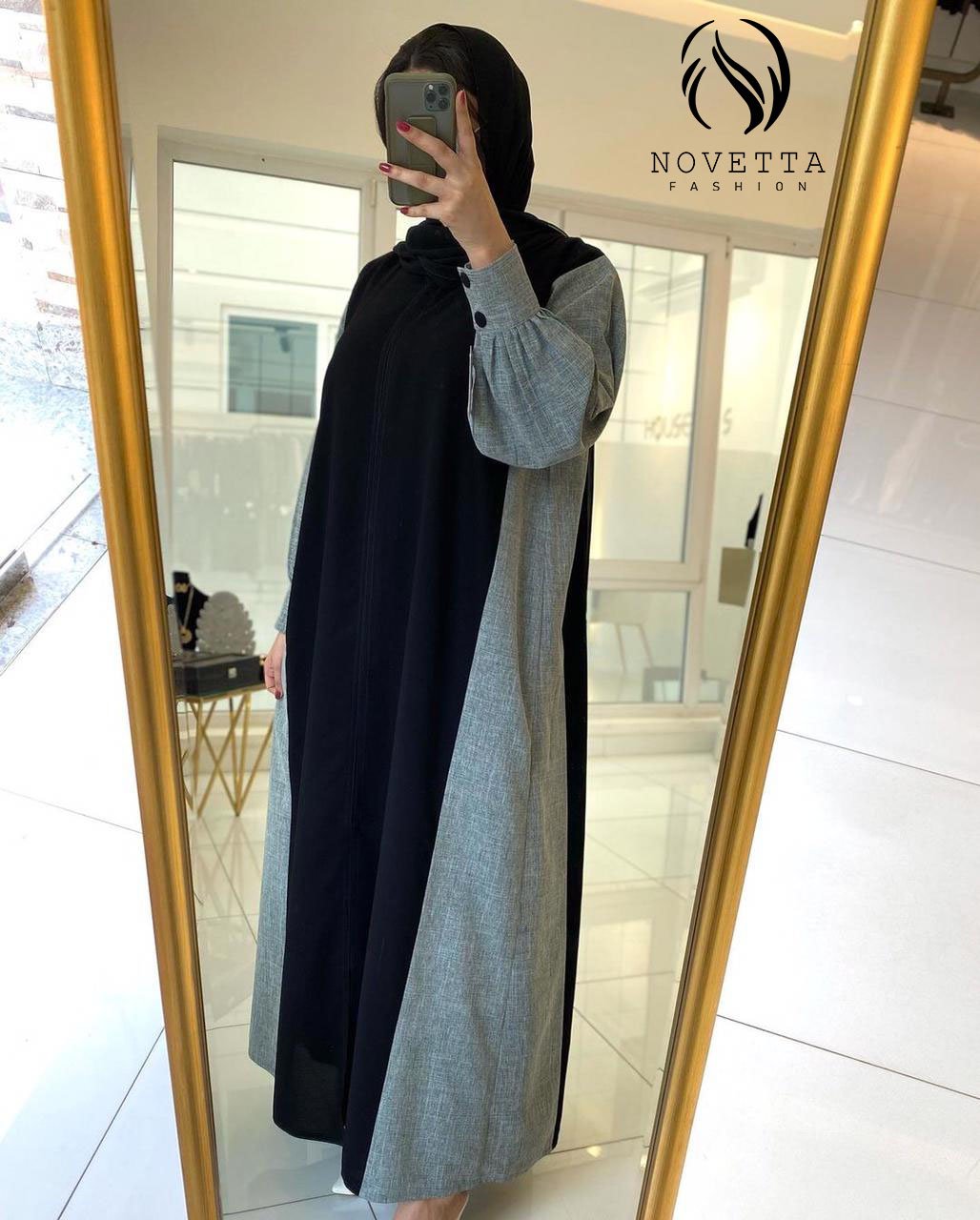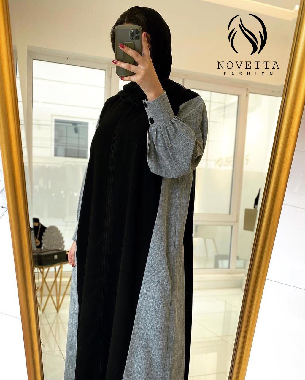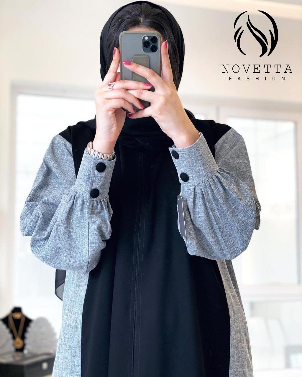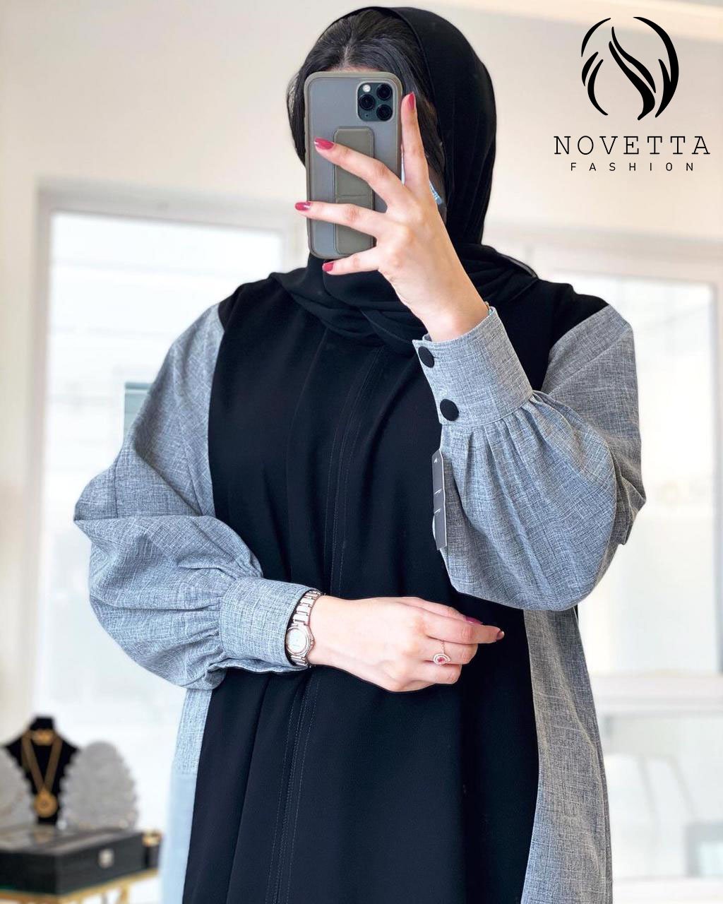 عباية أنيقة بتصميم مودرن يجمع بين اللون الأسود والرمادي مع أكمام واسعة وأزرار بارزة لإطلالة عملية وعصرية.بخامة ملنج والمقاسات وافية وواسعة