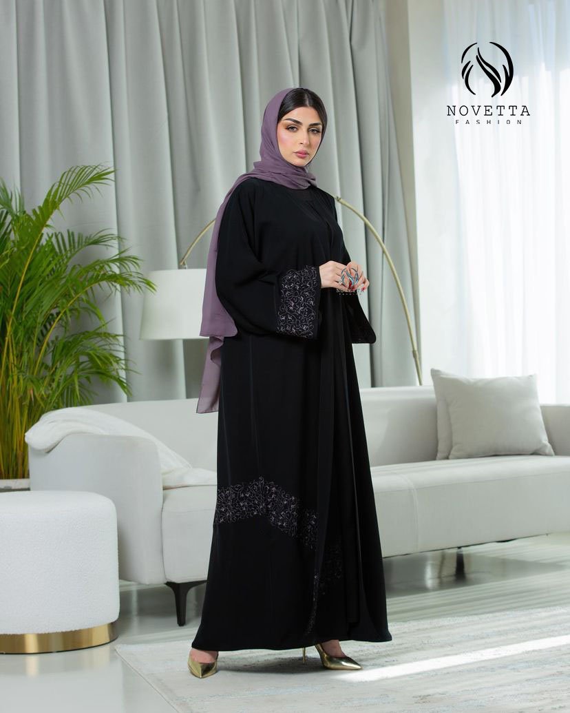 عباية سوداء فاخرة بتفاصيل تطريز ناعم على الأكمام والجزء السفلي، قصّة أنيقة وعملية تناسب المناسبات اليومية والرسمية.بخامة حبر مع فستان ستان والمقاسات وافية وواتسعة