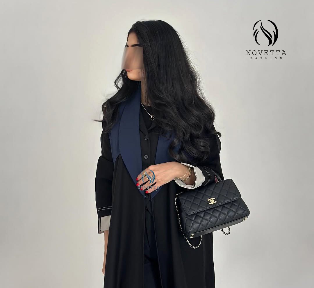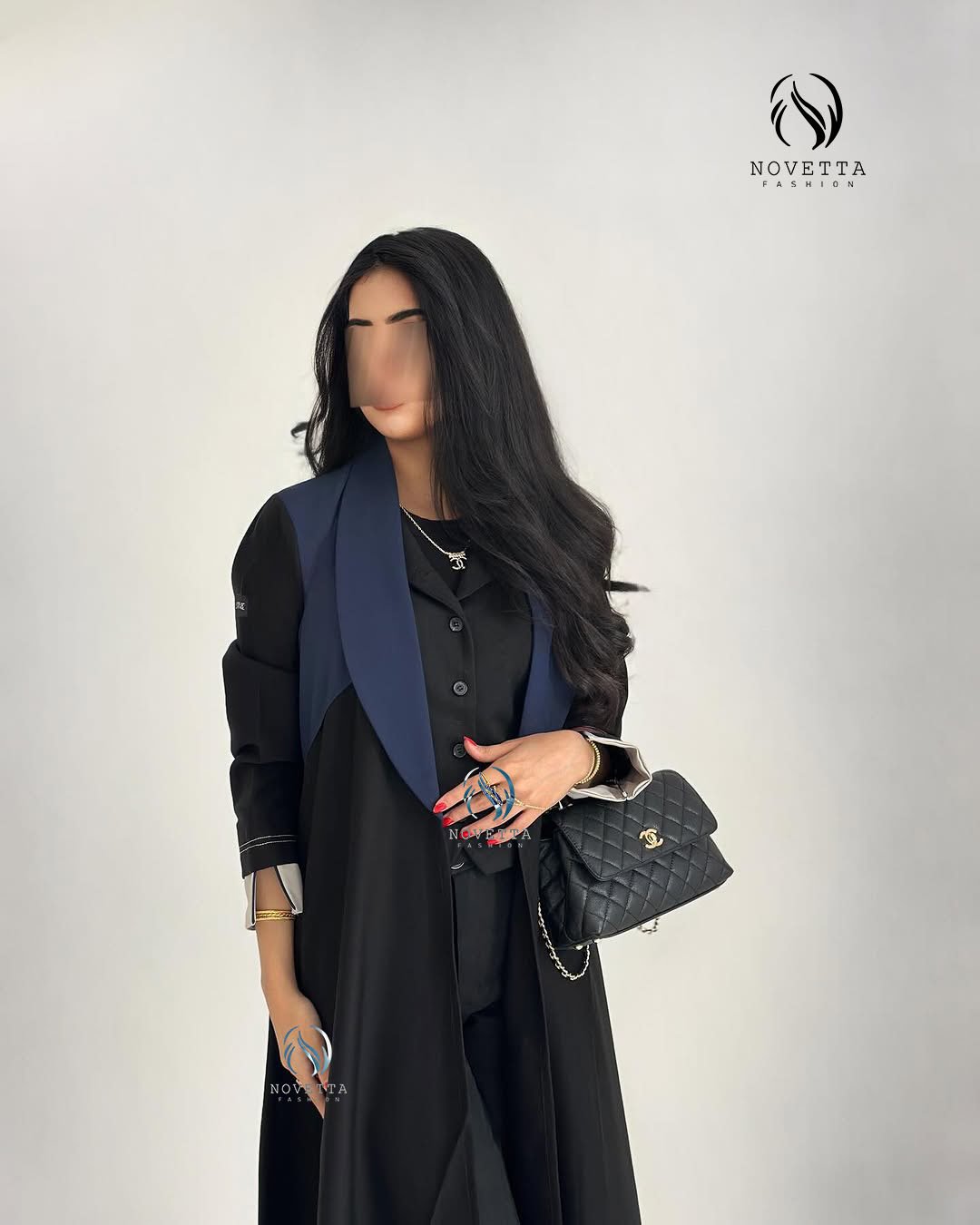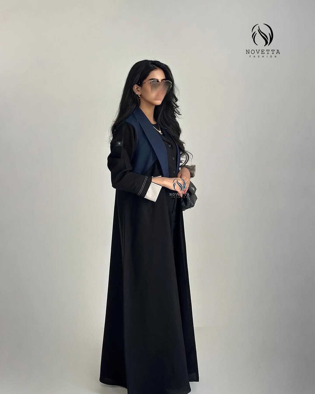 بليزر بتفصيل كلاسيكي مميز، بلمسة صدر جنزاري أنيقة تضيف عمق وجاذبية للعباية. تصميم يجمع بين القوة والرقي.بخامة فكتوريا كوري اسود والمقاسات وافية وواسعة