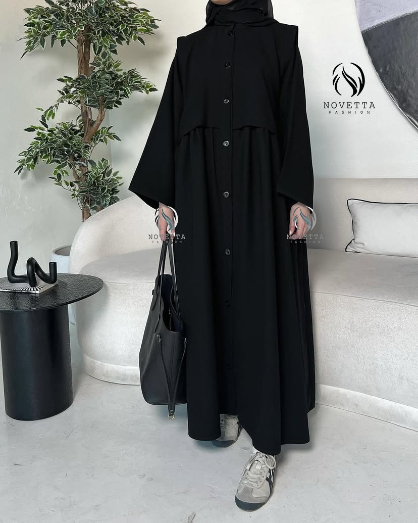 عباية سوداء أنيقة بتفصيل كاب علوي يعكس فخامة التصميم وهدوئه، مصنوعة من خامة ناعمة وعالية الجودة بقصة واسعة وانسيابية.بخامة كريب اندونيسي والمقاسات وافية وواسعة