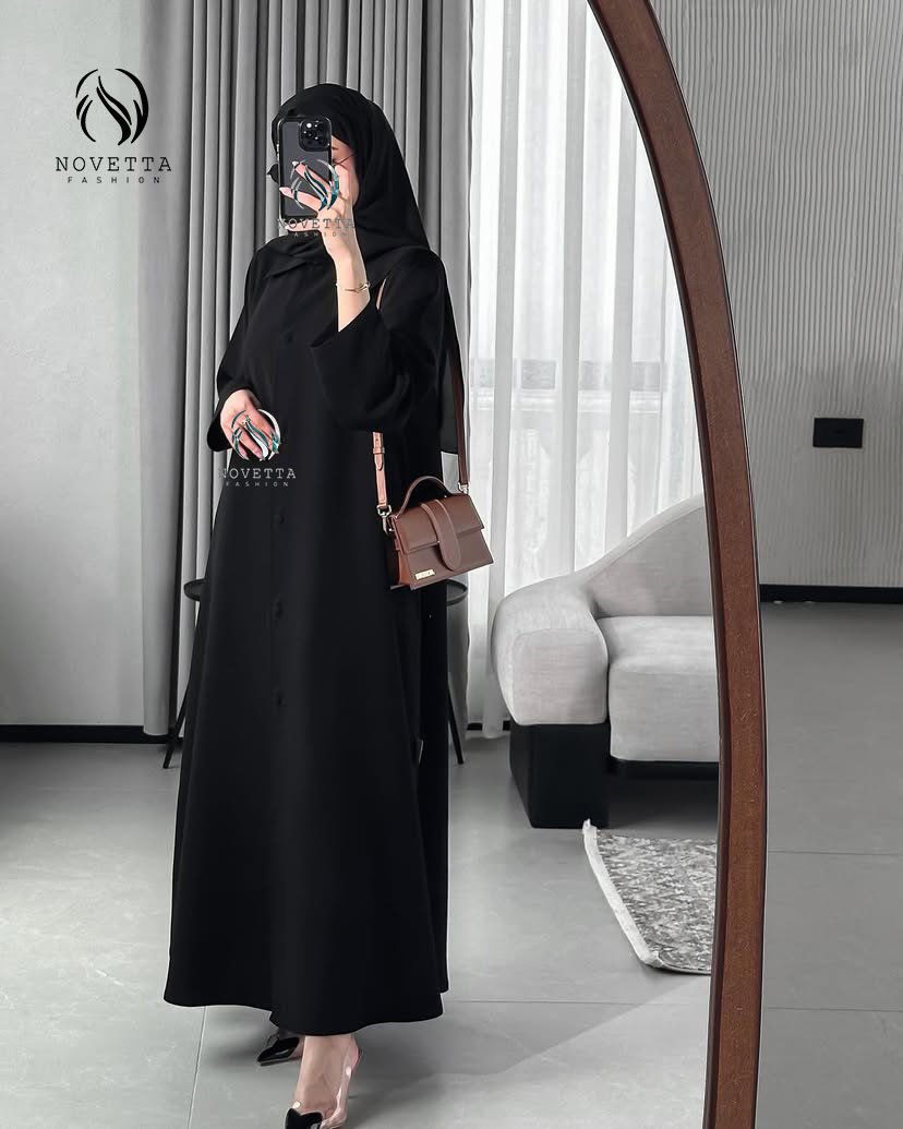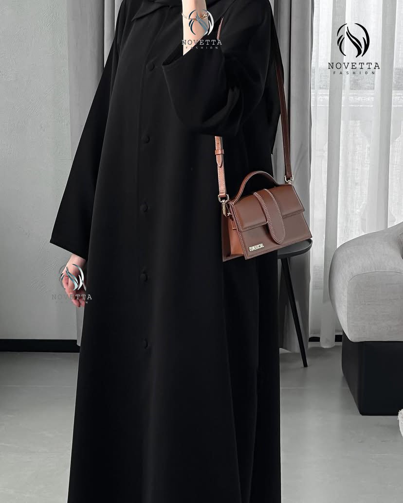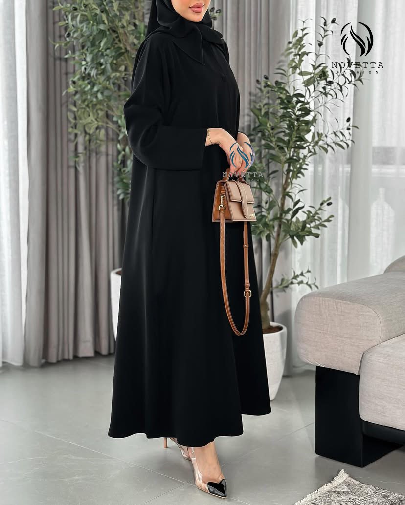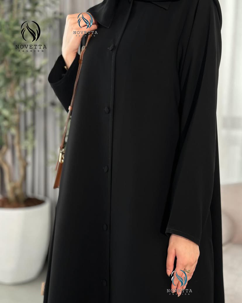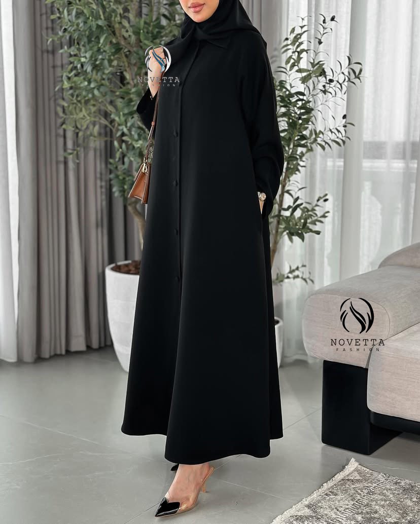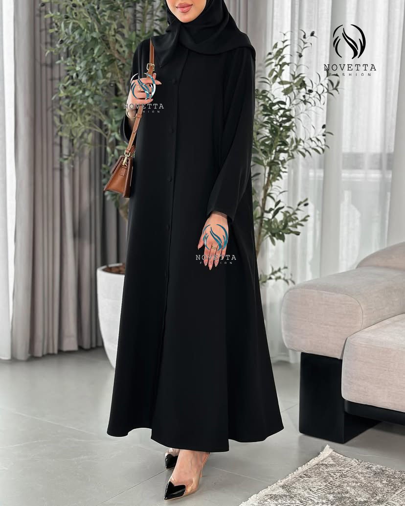 عباية سوداء بتصميم كلاسيكي أنيق، بخامة ناعمة وانسيابية، وأزرار أمامية مغطاة بالكامل تضيف لمسة من الرقي والبساطة. القَصّة واسعة ومريحة،بخامة كريب اندونيسي والمقاسات وافية وواسعة