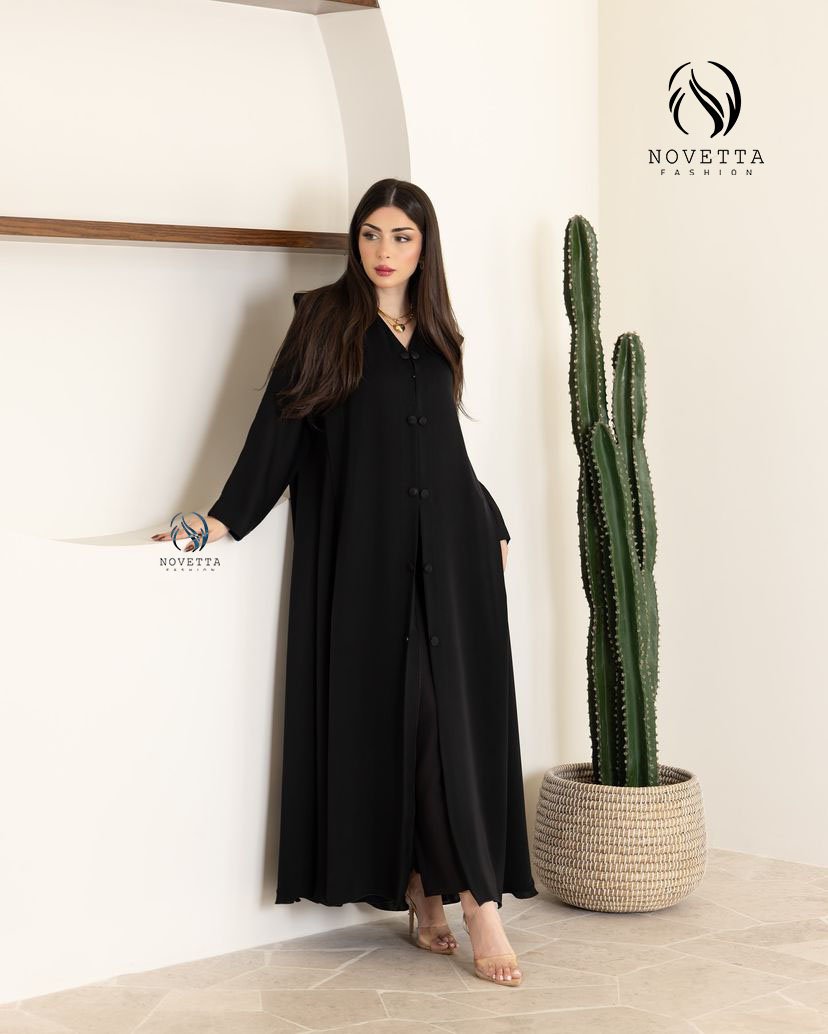 عباية فخمة باللون الأسود الكلاسيكي، تصميم ناعم بأزرار قماشية من الأعلى للأسفل، مع كتف مرفوع أنيق يضيف لمسة ملكية.بخامة اندونيسي تقيل سواد داكن والمقاسات وافية وواسعة