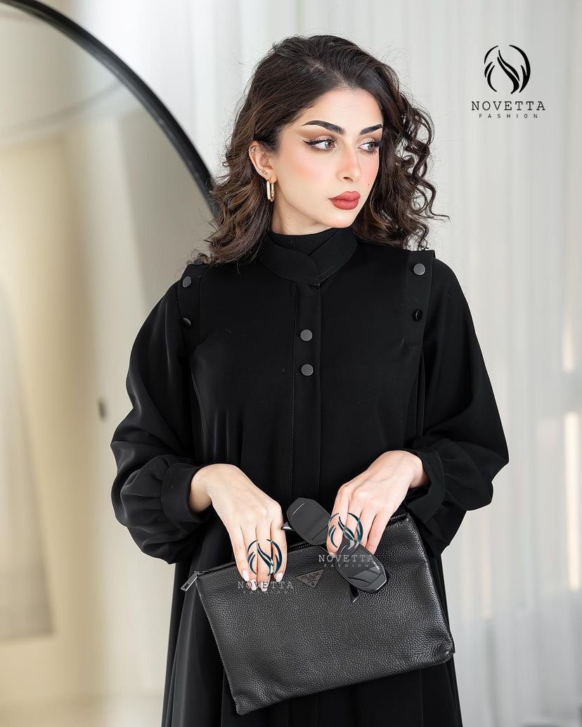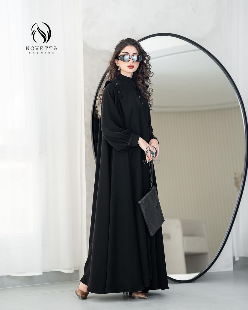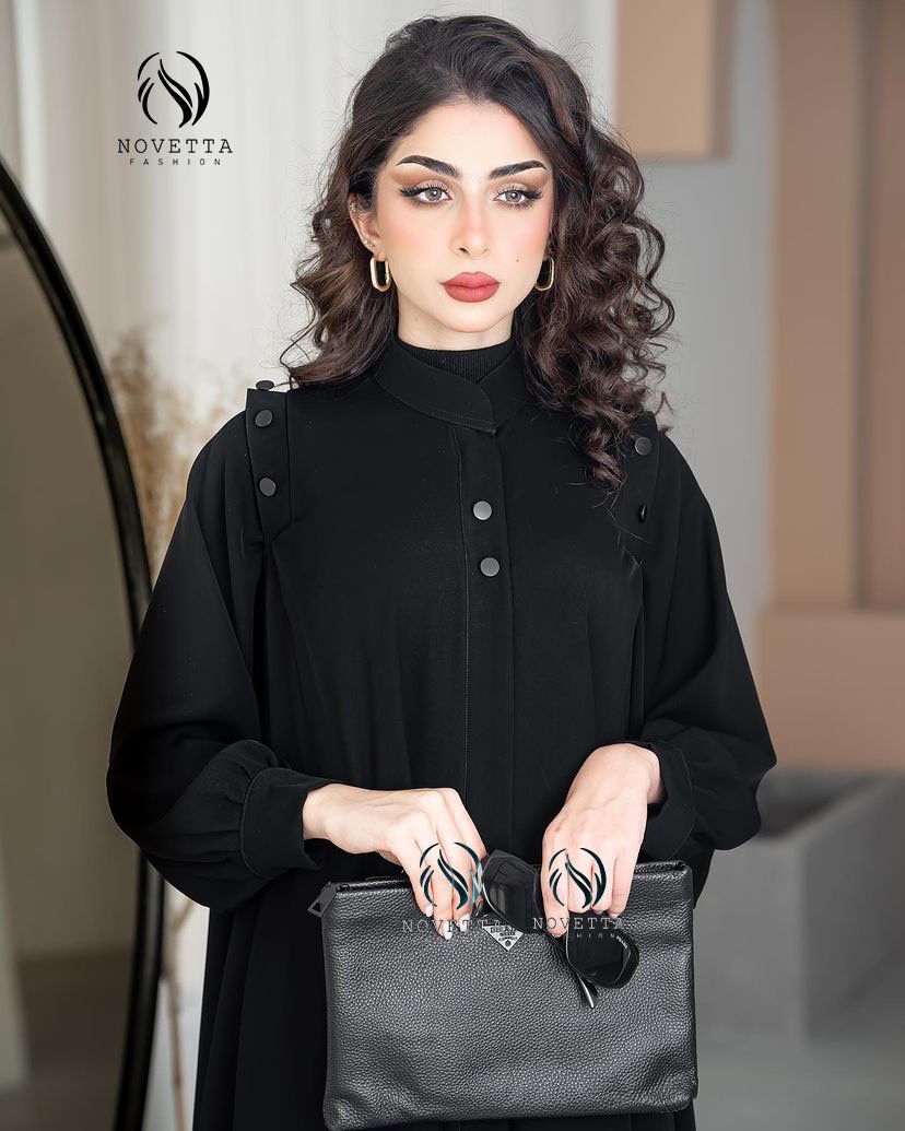 عباية سوداء أنيقة بتفاصيل أزرار عصرية على الأكتاف، مع قصة انسيابية تمنحك فخامة بسيطة وجاذبية عملية تناسب كل الأوقات.بخامة كوبرا اندونيسي والمقاسات وافية وواسعة