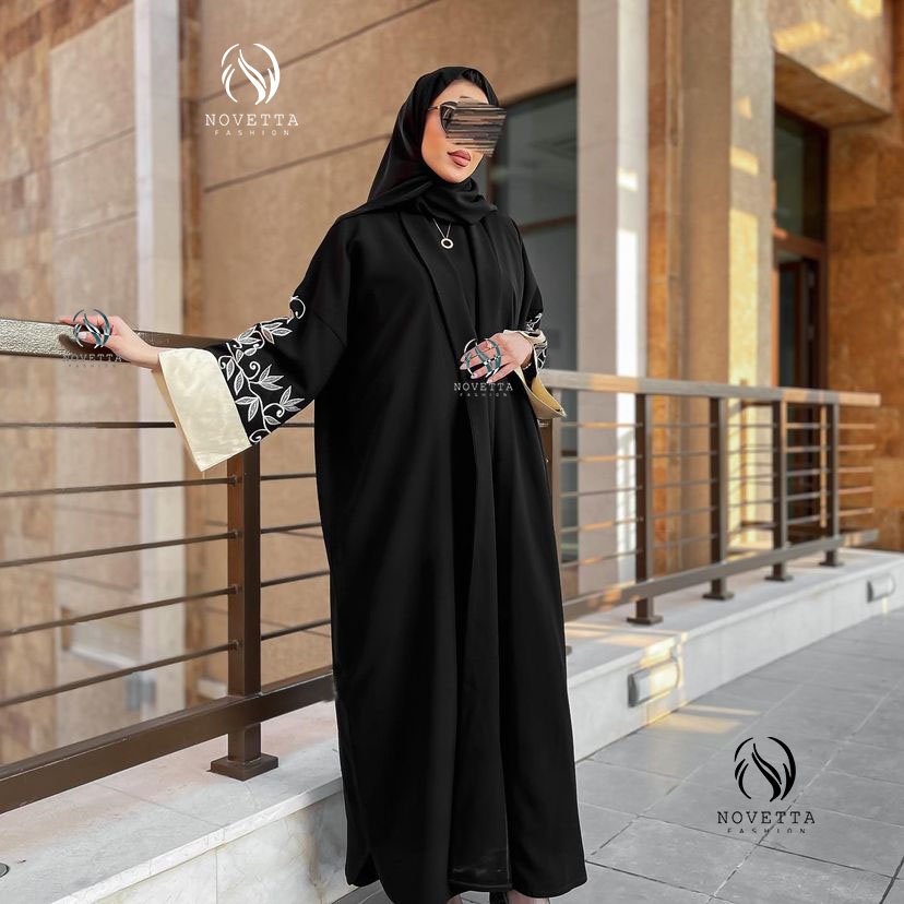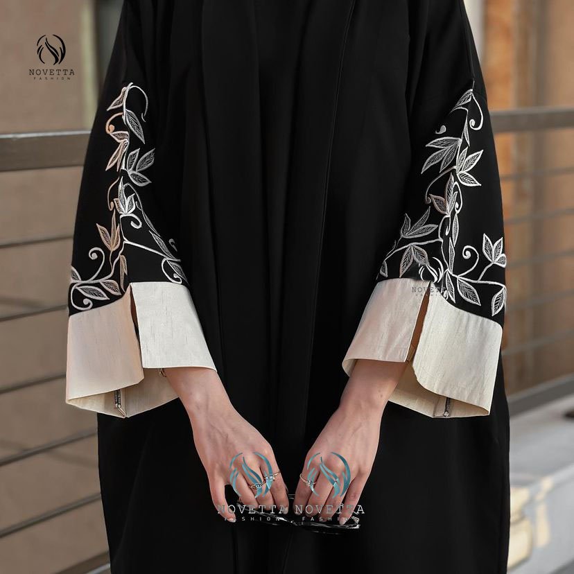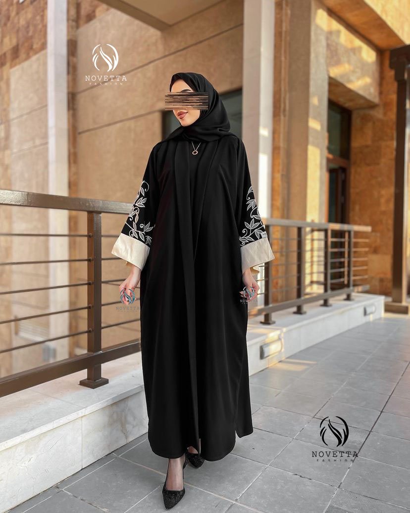 عباية سوداء بكم واسع أوف وايت مطرّز بأغصان الياسمين الفضية، تصميم أنثوي راقي يمزج بين البساطة والفخامة.بخامة حبر اندونيسيوالمقاسات وافية وواسعة