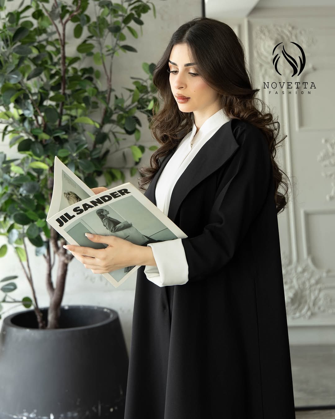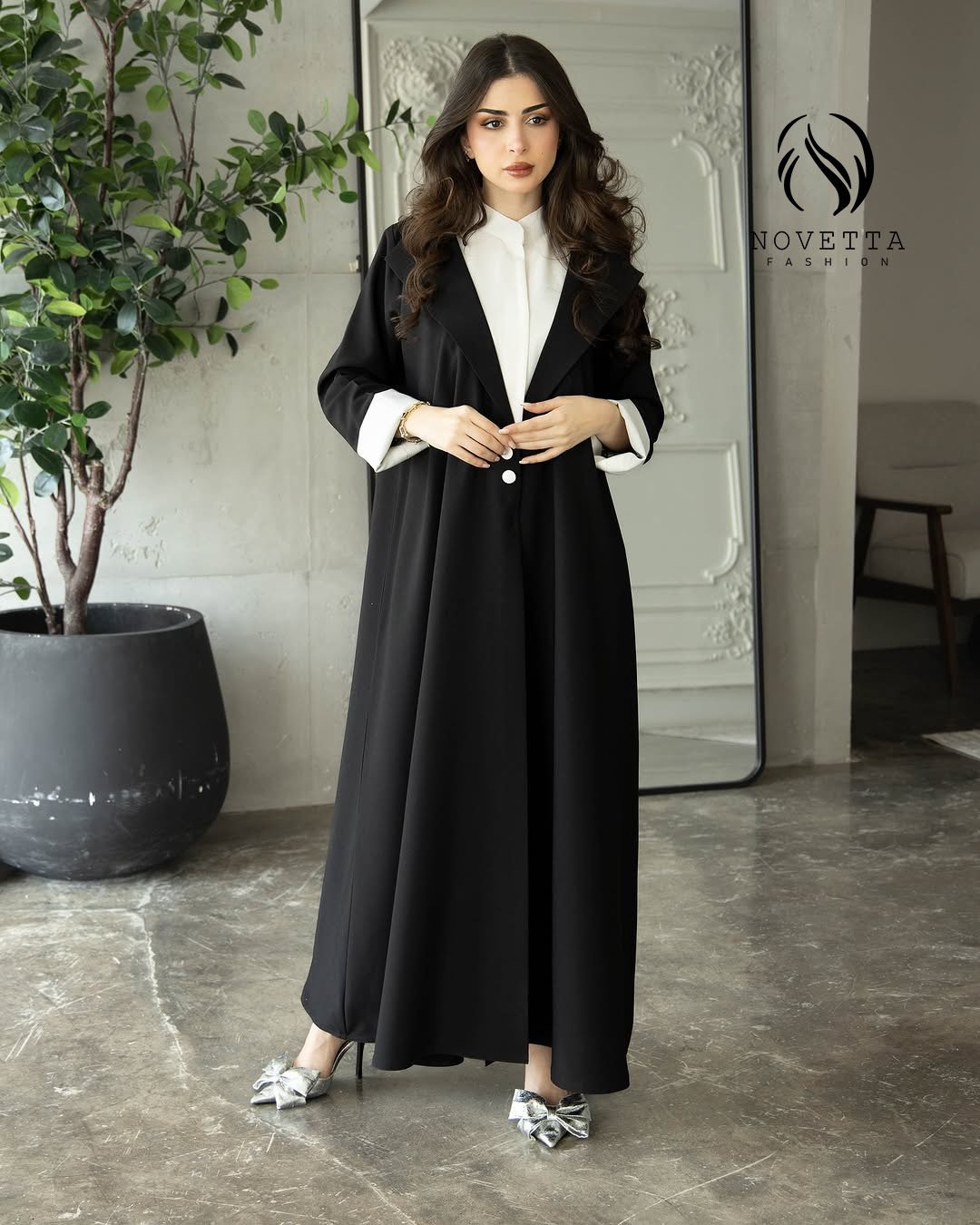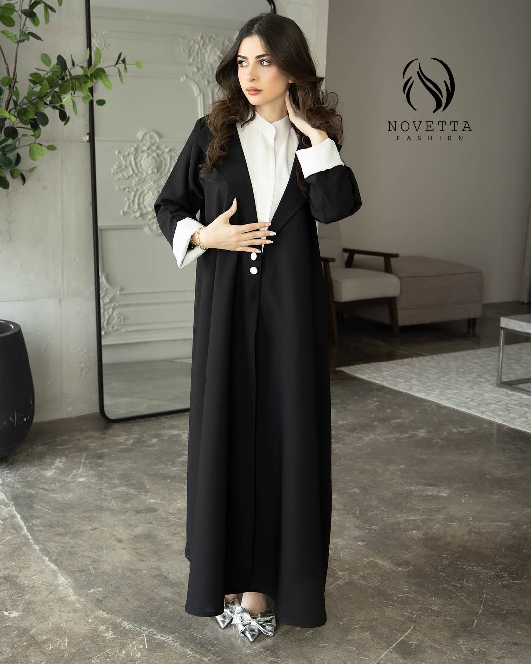 عباية رسمية وفخمة بقصة بليزر ناعمة، قماش كريب كوبا اندونيسي هدلة وناعمة وراقي، بتفاصيل باللون الأبيض و المقاسات وافية و واسعة