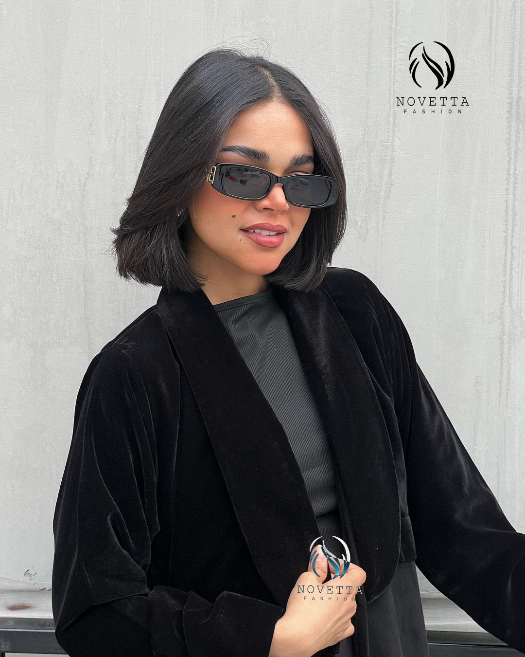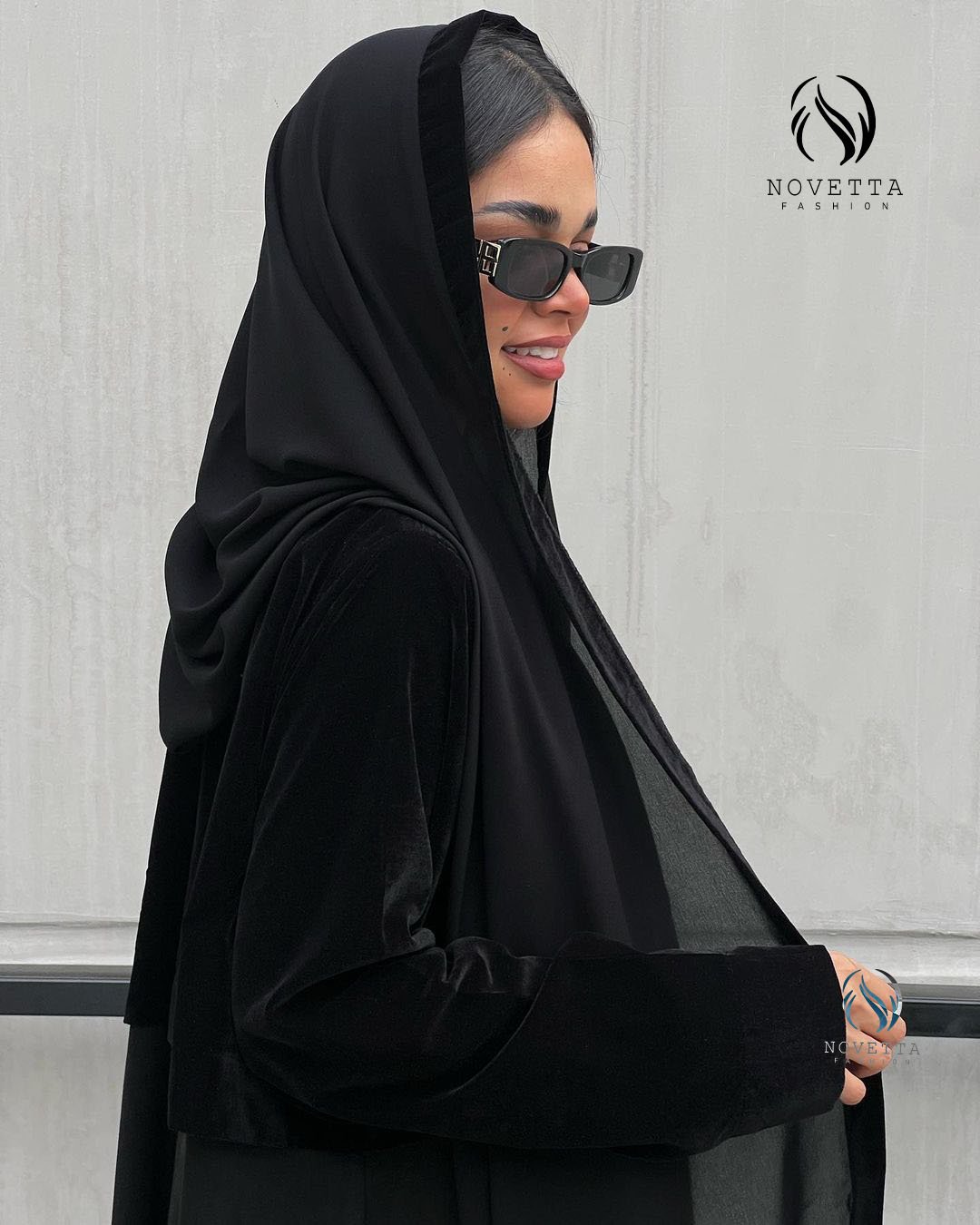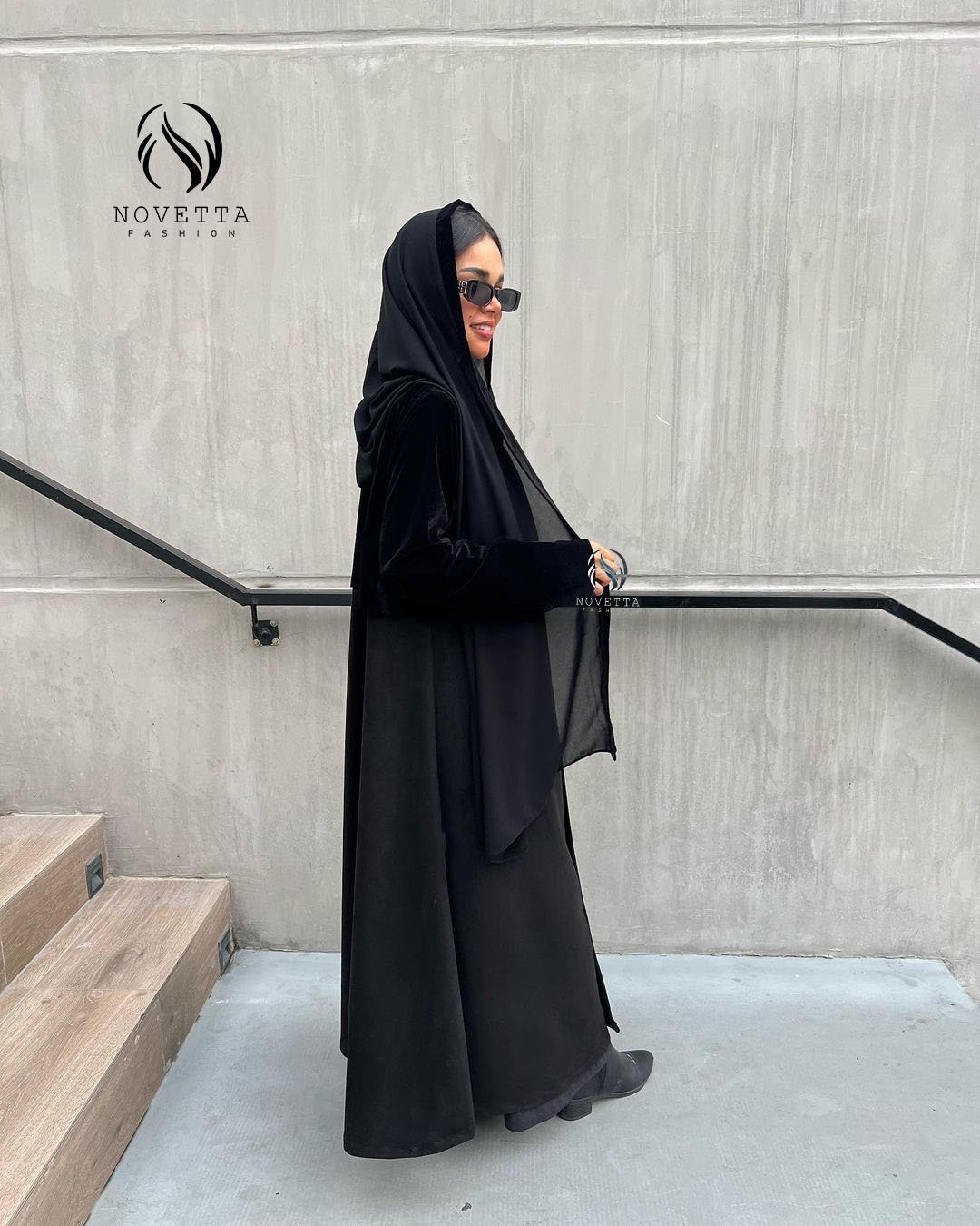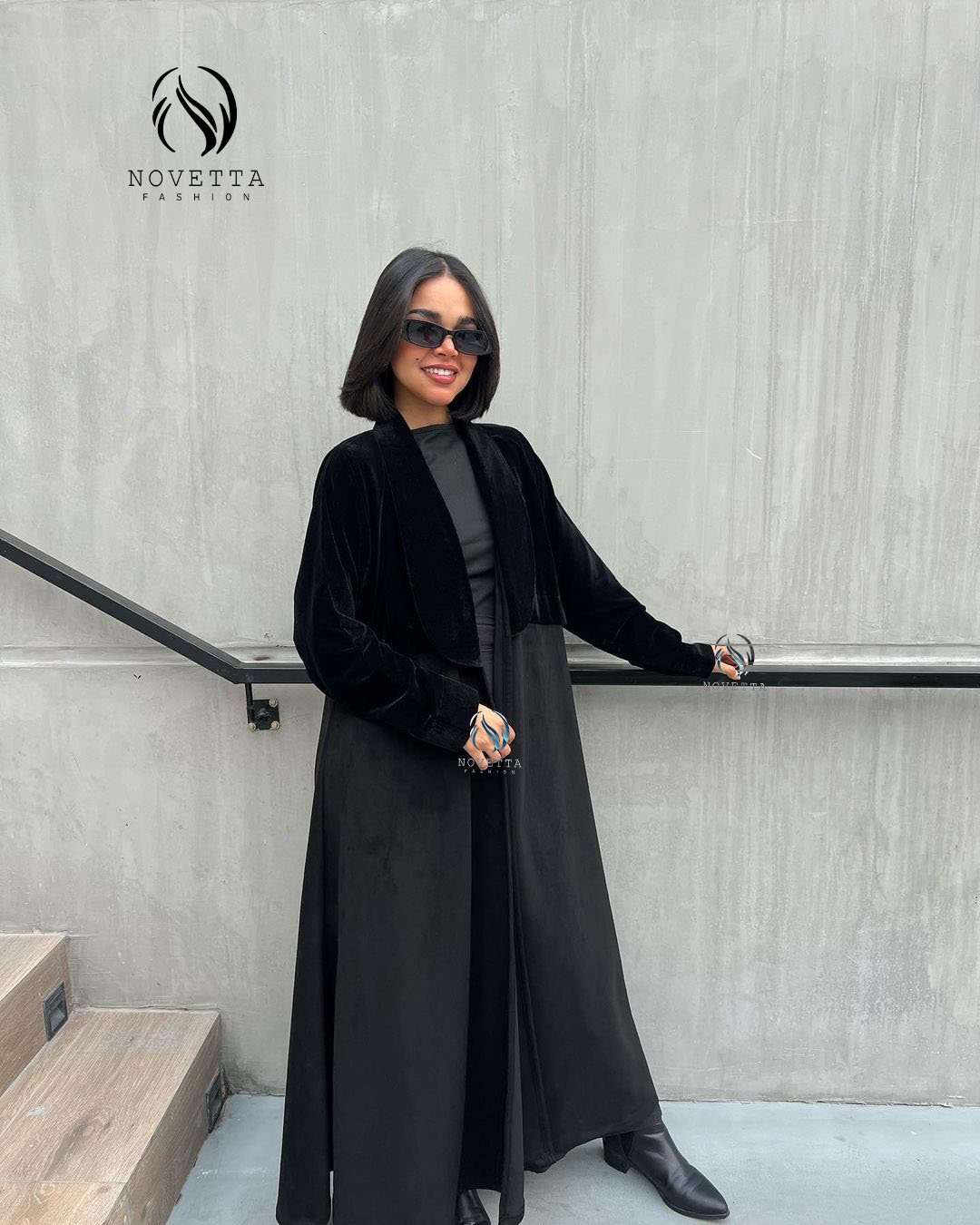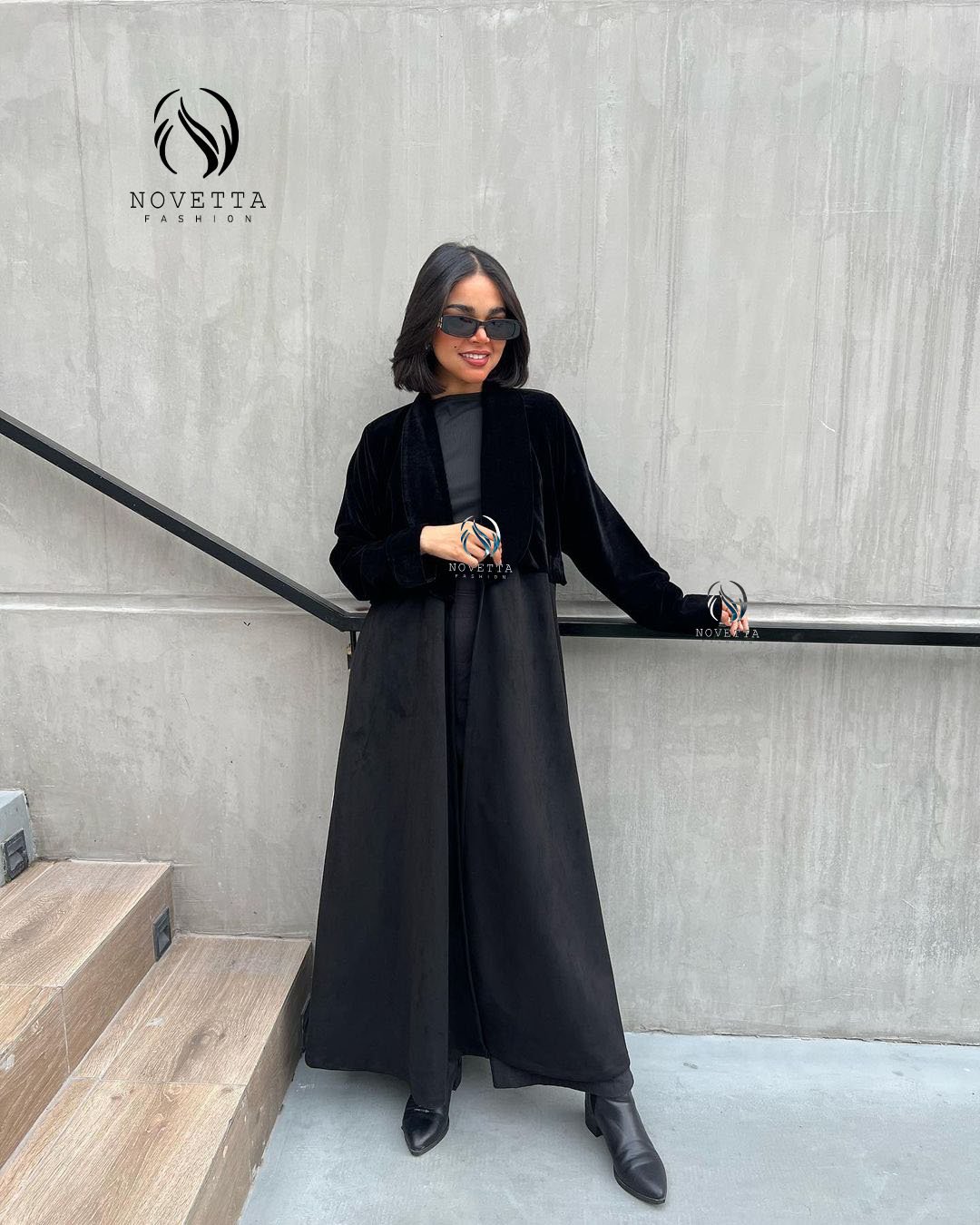 صميم يجمع بين الفخامة والبساطة، قبة وصدر من المخمل الأسود مع خامة انسيابية ناعمة تكمل اللوك الراقي.بخامة نخمل وشامواه,المقاسات وافية وواسعة